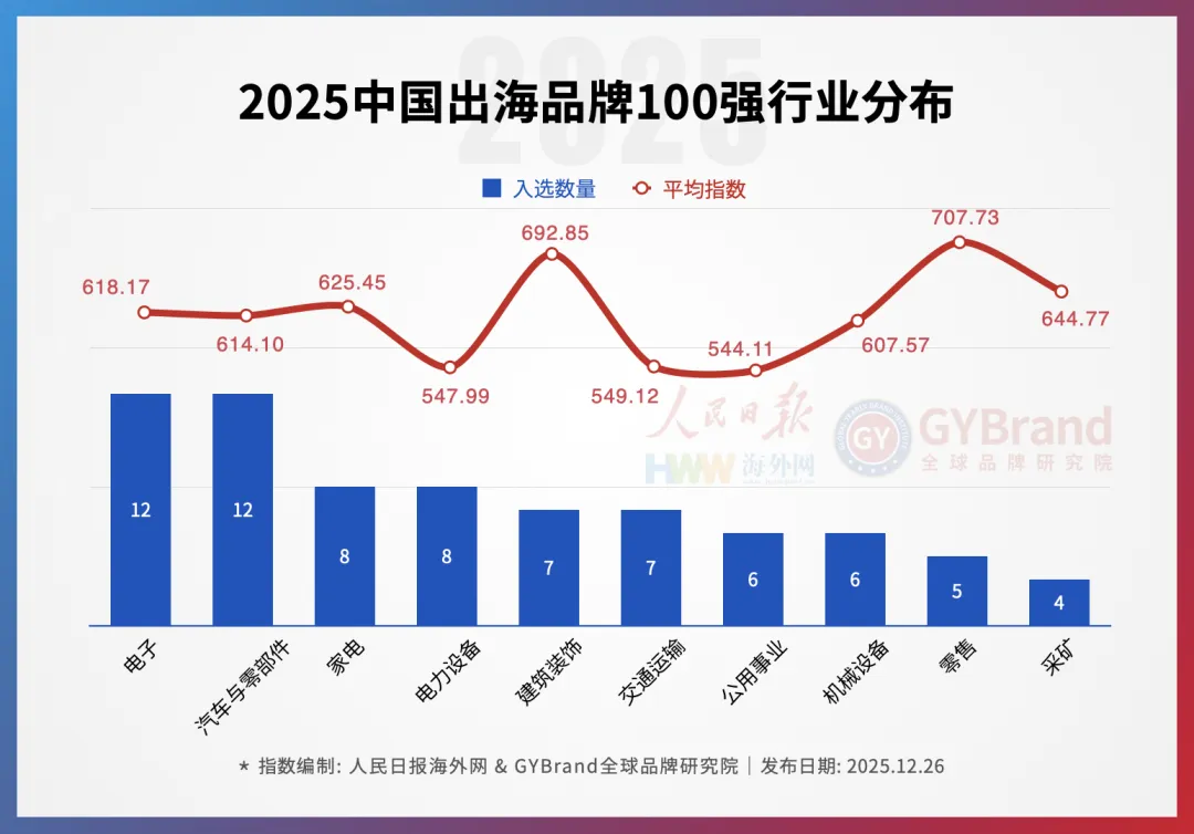 3.从行业维度看,2025中国出海品牌百强名单分布于20个行业。其中,电子、汽车行业是“规模主力”,建筑装饰、零售行业则是“实力标杆”,这一格局既体现了中国制造业的出海根基,也反映出消费类、服务类品牌在海外市场的进阶潜力。