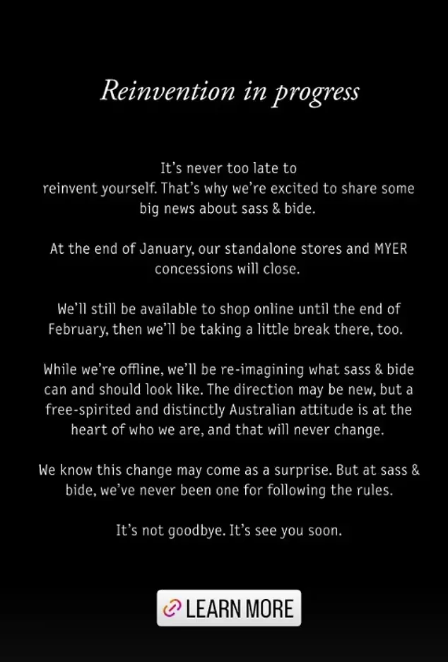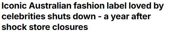 作为曾经被视为“澳洲时装名片”的设计师品牌,Sass & Bide在声明中确认,所有独立门店以及百货公司内的专柜将于1月底全部关闭,线上商店则运营至2月底后暂时下线。