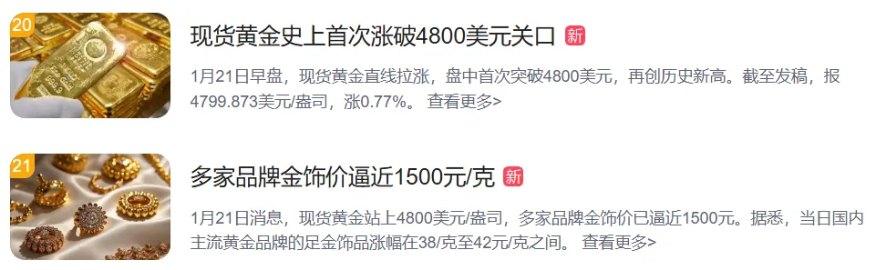1月21日,“现货黄金史上首次涨破4800美元关口”冲上热搜。
