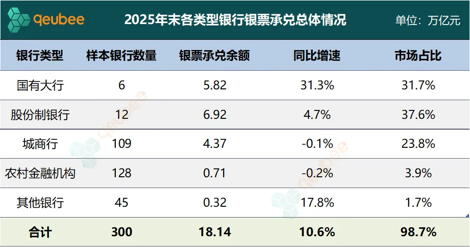 银行承兑汇票(简称“银票”)承兑业务是银行实质经营风险的票据业务,是银票各项业务的起点。通过对各家银行银票承兑规模进行整理分析,我们今天发布2025年银行银票承兑规模排行榜。2025年末,全市场商业汇票承兑余额21.2万亿元,同比增长7%,其中银票承兑余额18.4万亿元,同比增长8%左右,财票承兑余额继续下降,商票承兑余额小幅增长。qeubee对银票承兑余额排名靠前的300家银行数据进行统计,2025年末,这300家银行银票承兑余额合计18.14万亿元,同比增长10.6%,占全市场银票承兑余额的98.7%。从不同类型银行银票承兑余额来看,2025年,股份制银行、国有大行、城商行是银票承兑的三大主力,农村金融机构承兑规模依然相对较低。股份制银行银票承兑余额6.92万亿元,市场占比37.6%,依然是市场最大的承兑方。由于国有大行银票承兑余额快速增长,其市场占比已提升至31.7%,显著高于城商行,逐渐接近股份制银行。