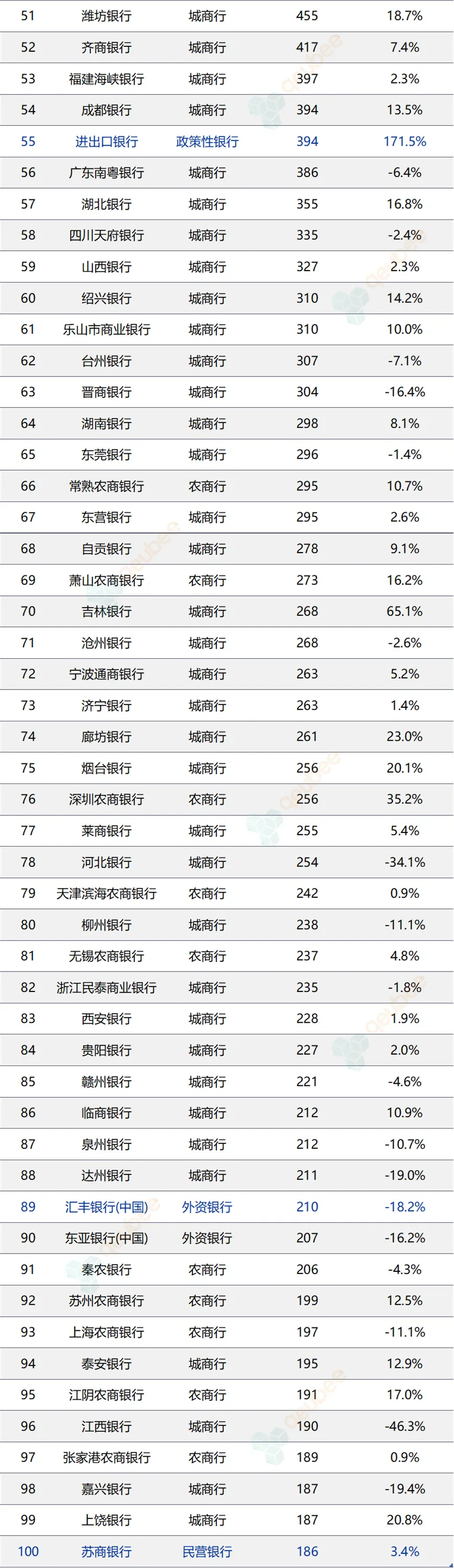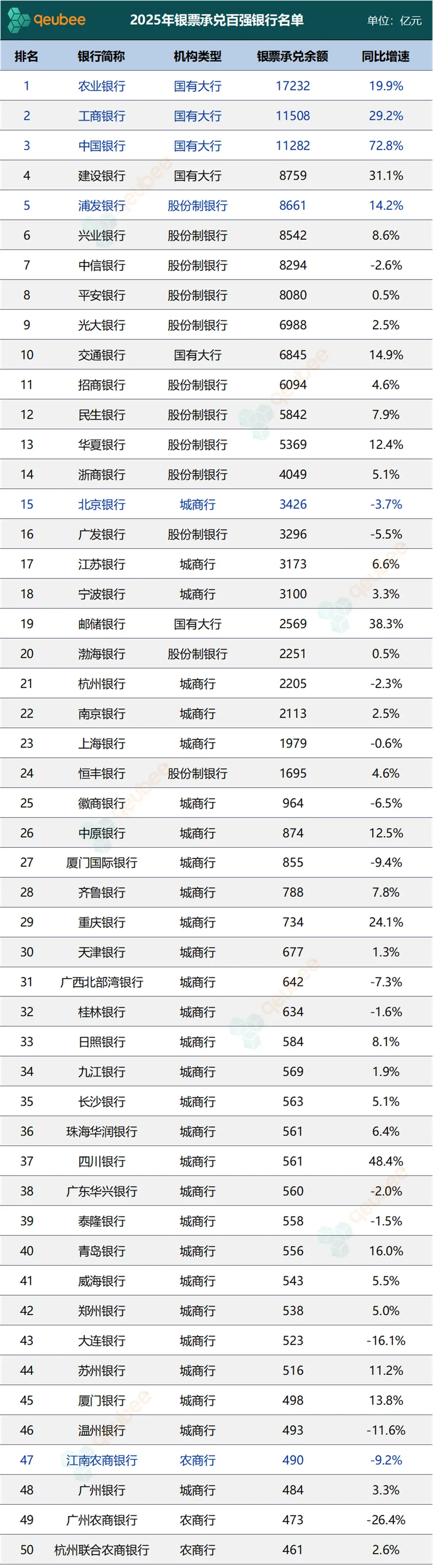 我们选取排名前100家银行制作2025年银票承兑百强银行名单,其中包括6家国有大行、12家股份制银行、65家城商行、13家农商行、2家外资银行、1家政策性银行、1家民营银行,入围门槛的银票承兑余额为185.6亿元。2025年末,农业银行、工商银行、中国银行位居银票承兑余额前三名,也是唯三规模超万亿元的银行,前四席均为国有大行,农业银行以17232亿元继续排名第一。股份制银行中浦发银行排名第一,城商行中北京银行继续排名第一,农商行中江南农商银行排名第一,外资银行中汇丰银行(中国)继续排名第一,政策性银行中进出口银行排名第一,民营银行中苏商银行继续排名第一。数据来源:票交所,qeubee整理