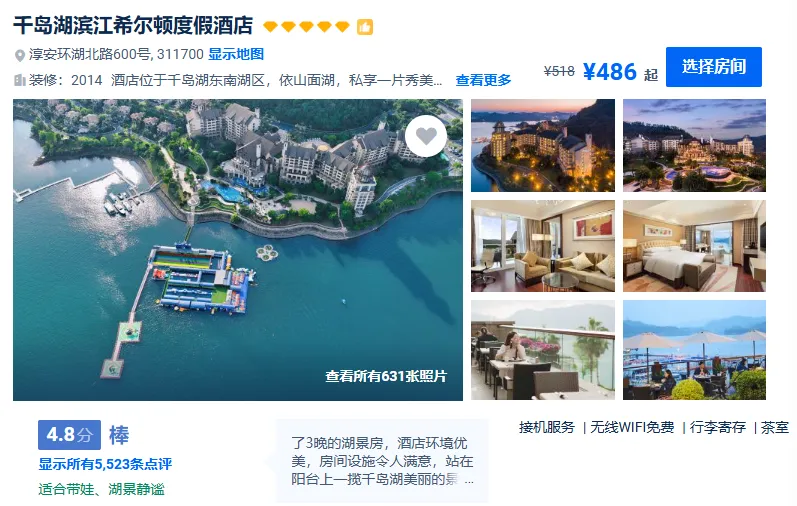 住宿:3晚千岛湖滨江希尔顿度假酒店标准间(单房差620元/人)