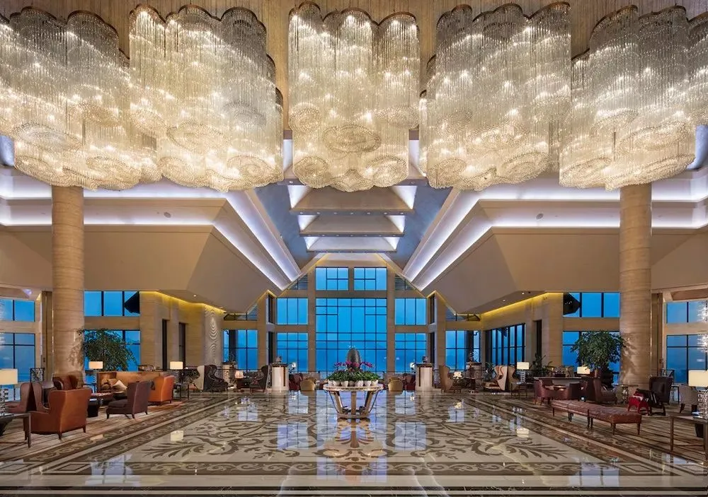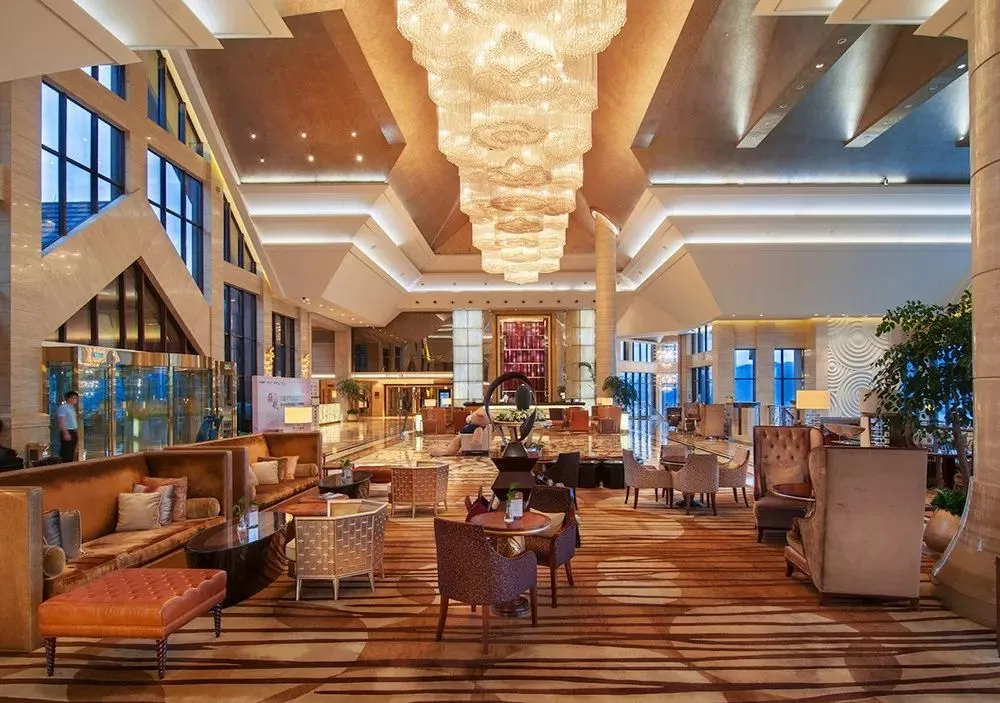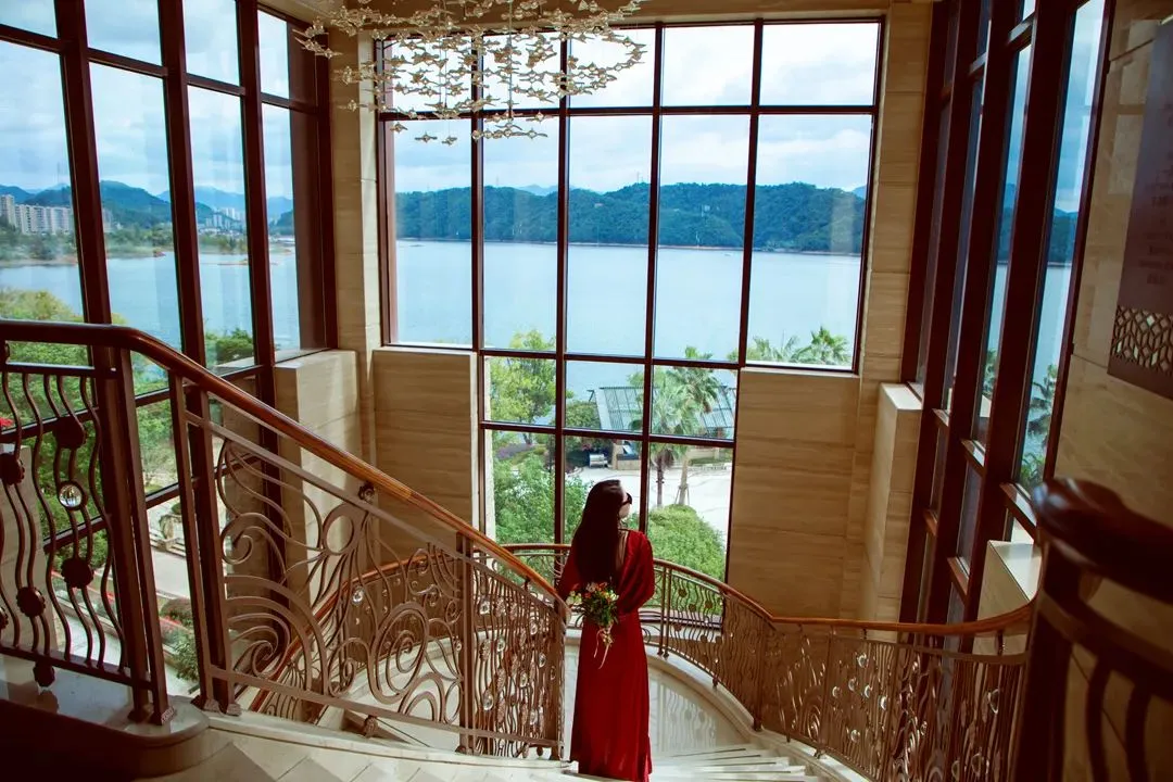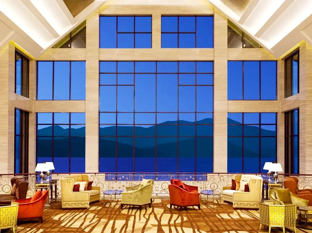 酒店大堂在五楼,直面湖景,通透的设计,让你目之所及都是湖光山色。