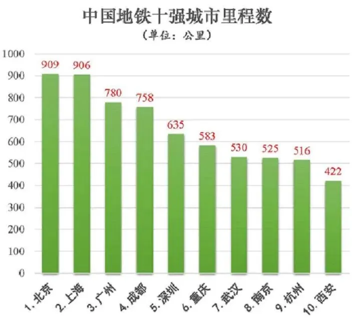 2025年年末地铁十强城市分别为:①北京、②上海、③广州、④成都、⑤深圳、⑥重庆、⑦武汉、⑧南京、⑨杭州、⑩西安。