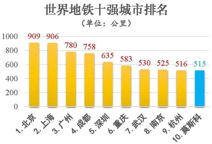 截止到2025年年底,世界城市地铁十强中,前九席为中国城市。十强中唯一的外国城市为俄罗斯的莫斯科,里程数515公里略逊于我国排名第九杭州的516公里。