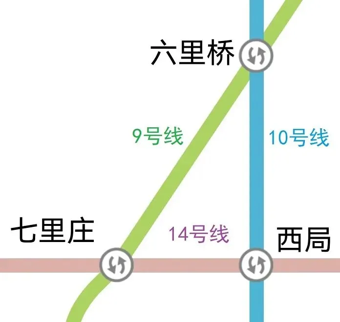 ④地铁线路最小三角形,如北京地铁9号线、10号线、14号线,在六里桥站、七里庄站、西局站,构成一个可以相互换乘的单边为1个站间距的最小三角形。