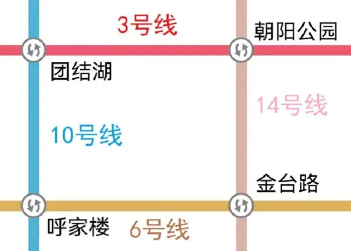 ⑤地铁线路最小四边形,如北京地铁3号线、6号线、10号线、14号线,在团结湖站、朝阳公园站、金台路站、呼家楼站,构成一个可以相互换乘的单边为1个站间距的最小四边形。