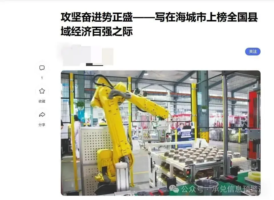 公开信息显示,海城是鞍山代管的县级市。相关报道提到,2025年7月23日,2025县域经济创新发展论坛在北京举行。《2025中国县域经济高质量发展研究》报告及2025全国县域经济百强榜单,正式发布。辽宁省海城市跻身中国县域经济百强县行列,位列第91位,实现了在全国县域发展中的争先进位。这一“成绩”还写进了海城市2025年政府工作报告。而发布这一榜单的机构为“赛迪顾问”。