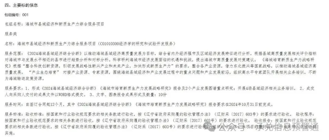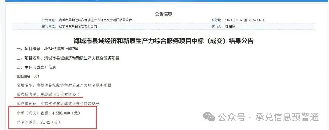 极目新闻记者通过查询辽宁政府采购网获悉,2024年6月,赛迪顾问股份有限公司以总得分85.42分,中标“海城市县域经济和新质生产力综合服务项目”,中标(成交)金额为498万元。项目采购方为海城市工业和信息化局。