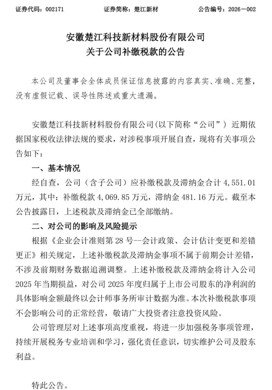 安徽楚江科技新材料股份有限公司(以下简称“公司”) 近期依据国家税收法律法规的要求,对涉税事项开展自查,现将有关事项公告如下: