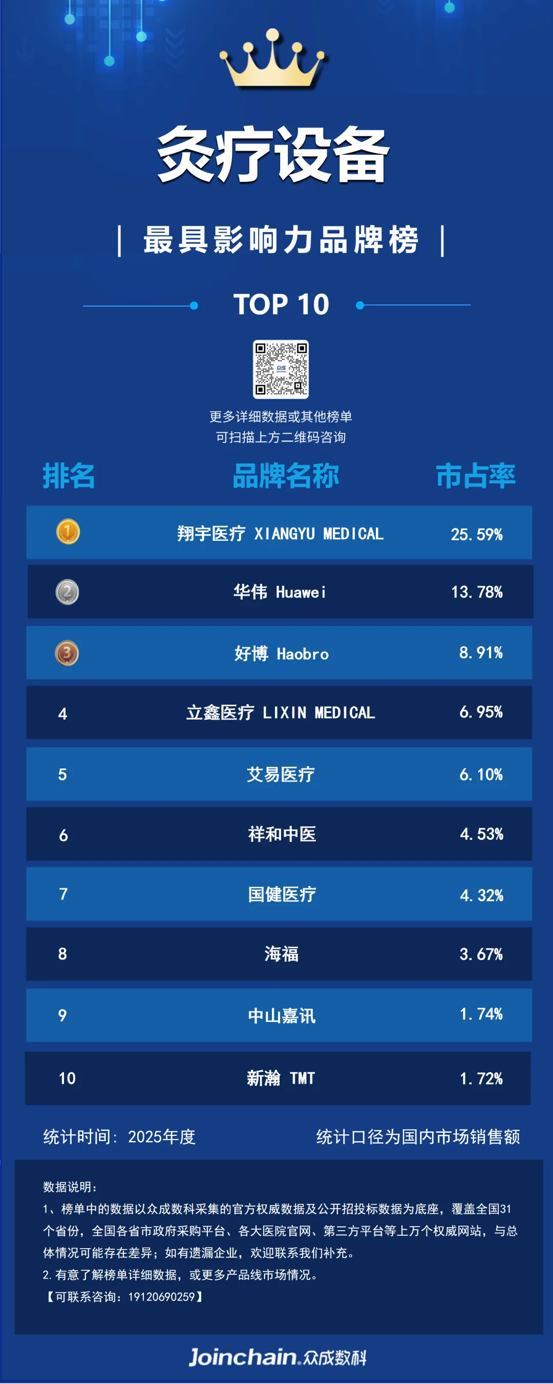 据众成数科医械云标讯MDBIDS统计分析,2025年中国灸疗设备排名前三的品牌为翔宇医疗(25.59%)、华伟(13.78%)、好博(8.91%)。