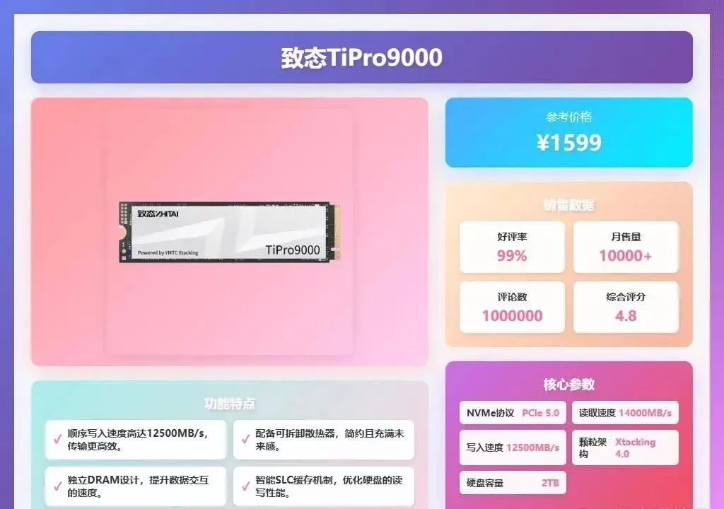 致态TiPro9000采用PCIe 5.0接口,顺序读取速度最高可达14000MB/s,写入速度也达到12500MB/s,性能确实挺抢眼。这样的速度对于大文件传输或高负载应用来说,提升体验比较明显。它搭载了长江存储新一代晶栈Xtacking 4.0架构的闪存颗粒,能够更充分地释放闪存性能,顺畅应对各种高速读写需求。