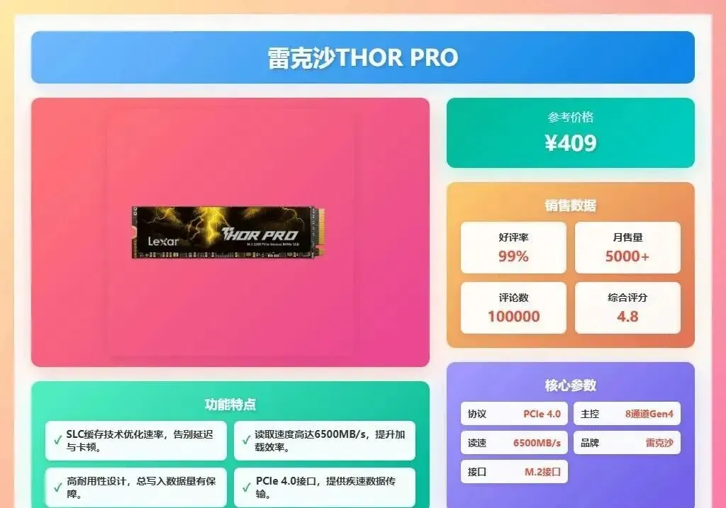 雷克沙THOR PRO的耐用性表现也挺不错,1TB版本支持600TBW的总写入量,能够满足较长周期的高强度写入需求。轻巧的尺寸和仅6克的重量便于安装,同时散热表现良好,游戏加载快速流畅。它不仅适合玩家使用,对内容创作者来说也能带来更高效的工作体验。购机建议:追求高速稳定和较高耐用性的用户可以考虑这款SSD,性能价格比例还算合理。