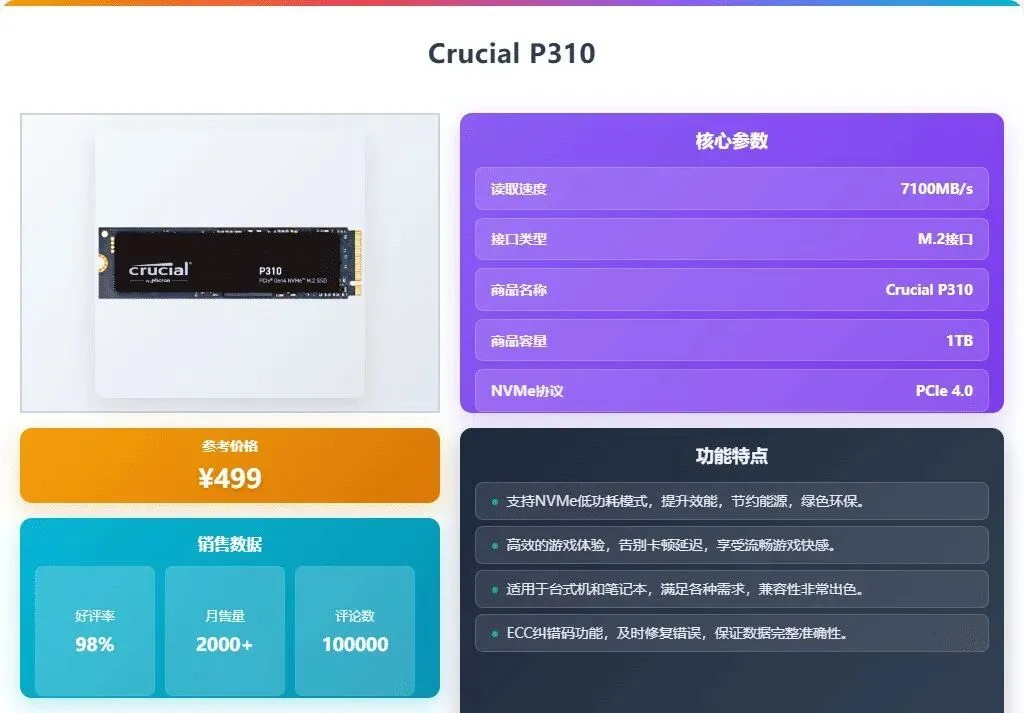 这款固态硬盘支持500GB、1TB和2TB多种容量选择,满足不同存储需求。Crucial P310采用美光3D NAND闪存和创新控制器技术,提升了数据安全性和稳定性。特别是它的多步冗余数据完整性算法和断电保护设计,为数据保驾护航,使硬盘在运行中更加可靠,使用过程中也能减少数据丢失的风险。