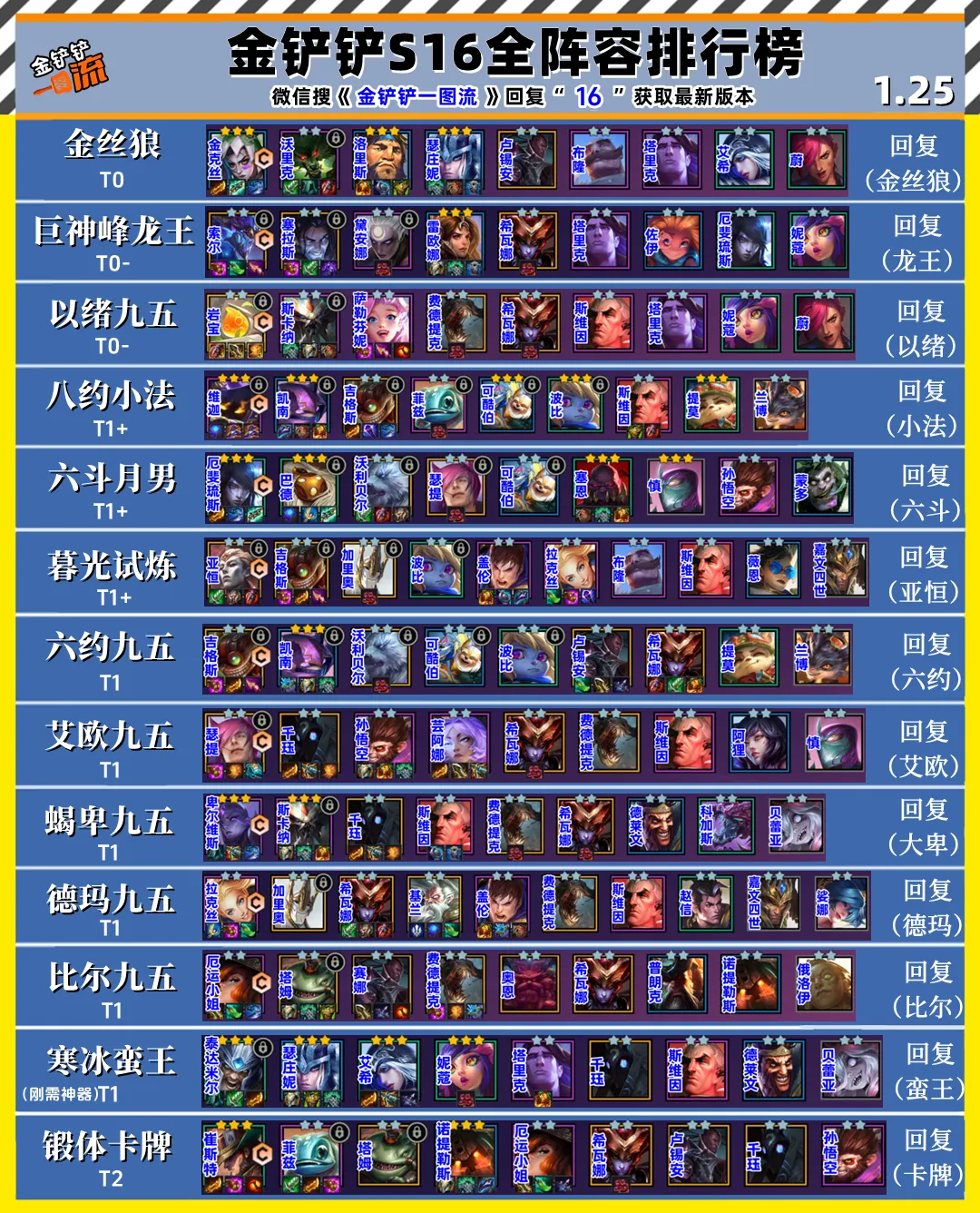 >1月25号金铲铲S16排行榜,金丝狼独一档,龙王岩宝第二档!