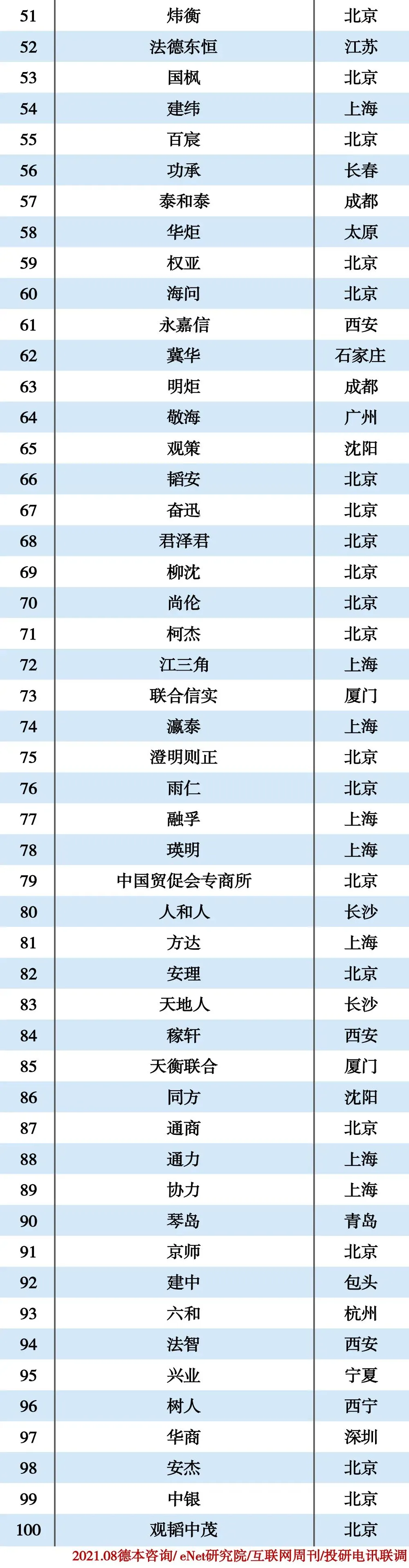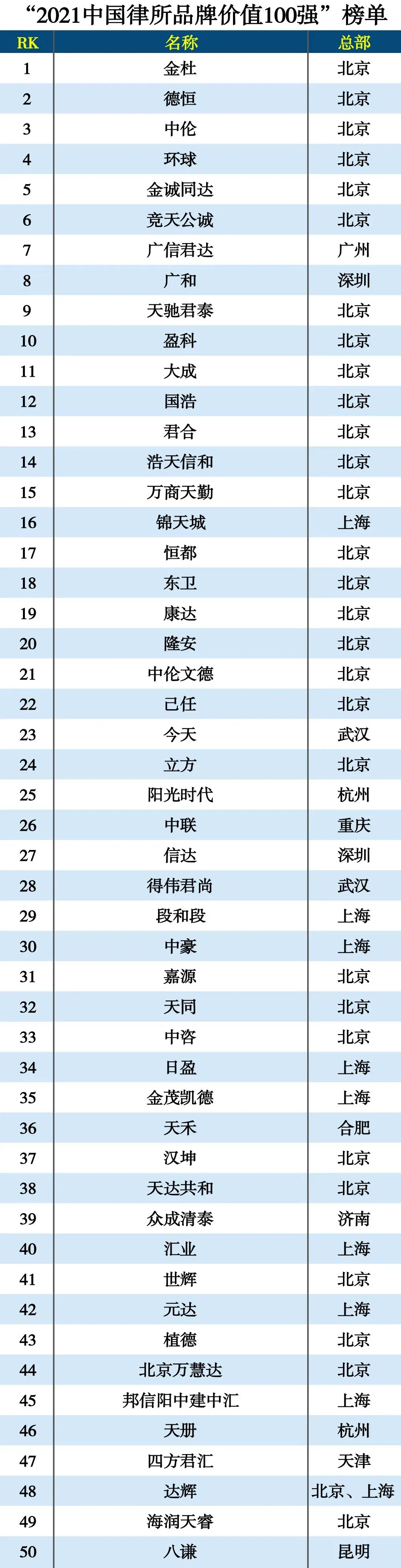 彰显品牌价值助力法治中国,由德本咨询、eNet研究院、互联网周刊、投研电讯四家智库机构联袂推出的“中国律所品牌价值100强”榜单8月31日在京揭晓。金杜、德恒、中伦、环球和金诚同达分列“中国律所品牌价值100强”榜单前5名。