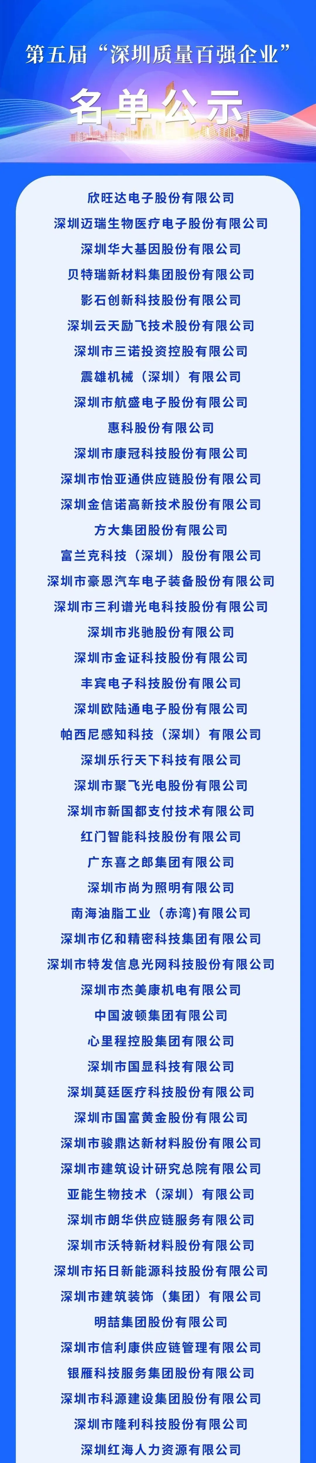 深圳市第五届“深圳质量百强企业”名单