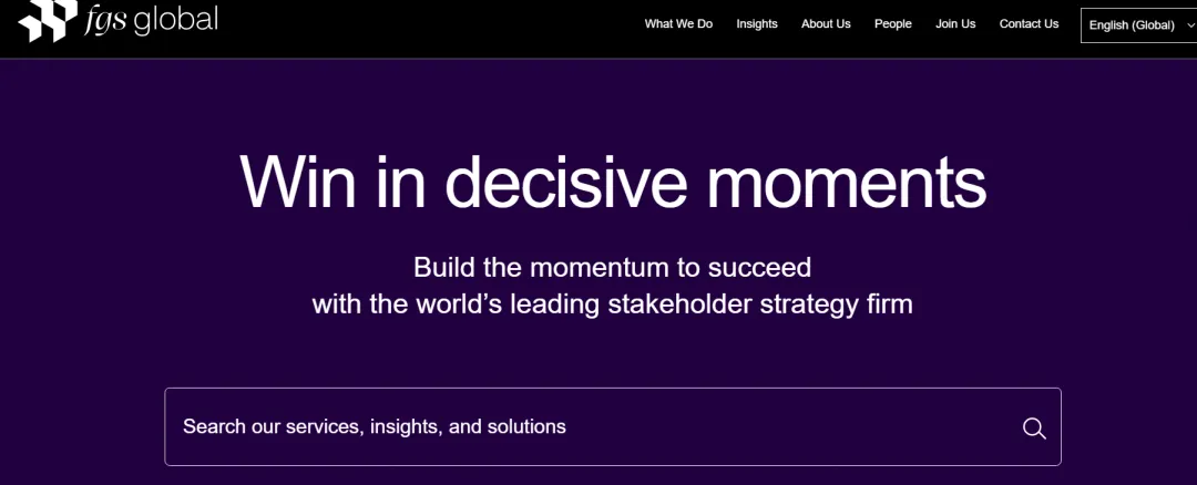 FGS Global 成立于 2021 年,由 Finsbury、Glover Park Strategy 和 Hering Schuppener 三家顶尖传播公司合并而成,隶属于 WPP 集团。在全球 20 个国家拥有办公室,2024 年费收入达 4.55 亿美元。这家公司专注于金融、法律和争议解决领域,核心团队由前政府官员、资深律师和金融分析师组成,能为客户提供高风险、高敏感事件的战略传播支持。其客户包括全球 TOP10 律所中的 8 家,以及众多跨国企业和投资机构。