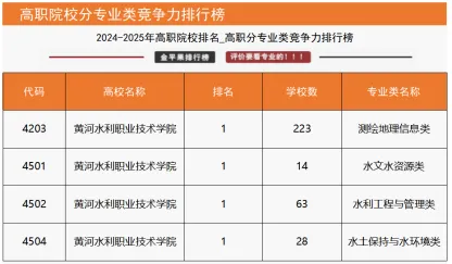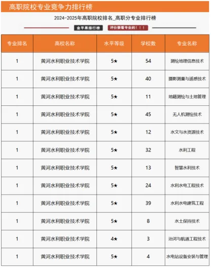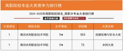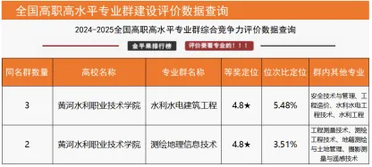 “国家级高水平专业群综合竞争力评价”数据显示,我校水利水电建筑工程专业群、测绘地理信息专业群2个高水平专业群上榜入围,在同类专业群中位列全国第一;“高职院校分专业大类竞争力排行榜”数据显示,我校资源环境与安全大类、水利大类2个分专业大类均位列全国第一;“高职院校分专业类竞争力排行榜”数据显示,我校测绘地理信息类、水文水资源类、水利工程与管理类、水土保持与水环境类4个专业类均位列全国第一;“高职院校专业竞争力排行榜”数据显示,我校14个专业上榜,其中测绘地理信息技术、摄影测量与遥感技术、地籍测绘与土地管理、无人机测绘技术、水文与水资源技术、水利工程、智慧水利技术、水利水电工程技术、水利水电建筑工程、水土保持技术、水电站设备安装与管理、治河与航道工程技术12个专业位列全国第一,测绘工程技术、水生态修复技术2个专业位列全国第二,土木工程检测技术、环境检测技术2个专业位列全国第三。