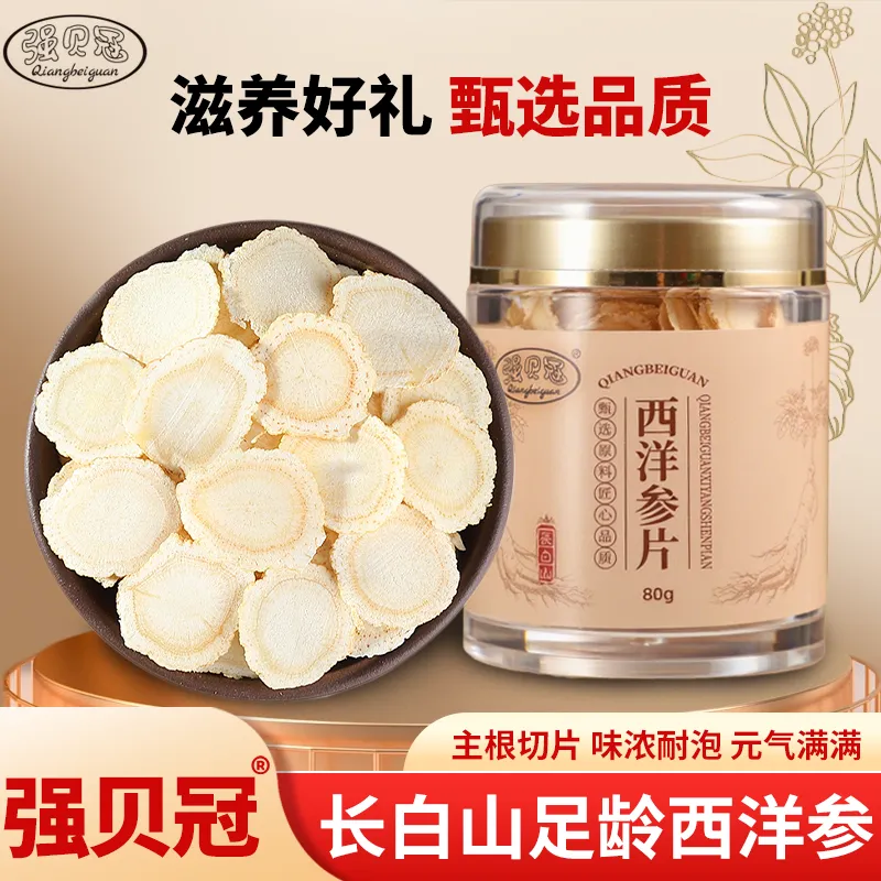 推荐二、强贝冠牌西洋参:专注长白山产区,切片工艺精湛,片形规整,易于日常冲泡。