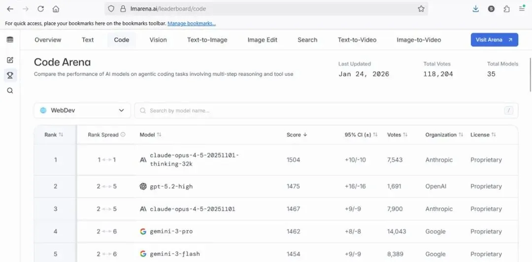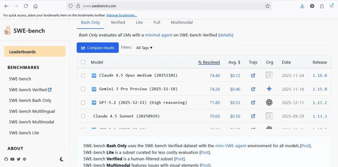 代码生成是AI应用价值最直观的体现之一。这类榜单关注模型编写程序的能力。SWE-bench堪称代码评测的黄金标准。它的独特之处在于真实性。测试题不是人工编造的算法题,而是从Django、Scikit-learn等知名开源项目中收集的真实GitHub Issues。模型需要理解问题描述,定位相关代码,提出修复方案,并确保修复通过所有测试用例。这是一个完整的软件工程流程,不是简单的代码片段生成。SWE-bench的价值不言而喻。它让我们看到,AI已经可以胜任相当一部分实际的软件开发工作。但它也有边界:它主要测试的是bug修复能力,而软件工程还包括架构设计、性能优化、安全审计等诸多方面。HumanEval是OpenAI开发的经典基准。它包含164个编程问题,每个问题给出函数签名和文档字符串,要求模型生成完整的函数实现。评估指标是Pass@1,即首次尝试就通过所有测试用例的概率。2026年初的数据显示,顶级模型已经接近90%的通过率。GPT-5达到89.4%,Claude 4.0 Sonnet为88.7%。HumanEval的优势是标准化程度高,便于横向对比。但它的局限也很明显:题目相对简单,主要考察基本的编程和算法能力,与真实项目中的复杂工程决策相去甚远。Code Arena采用与Chatbot Arena类似的人工盲测方法,但专门针对代码生成场景。开发者面对实际编程任务,对两个匿名模型的输出进行投票。这种方法的价值在于,它评估的不仅是代码的正确性,还包括可读性、健壮性、是否遵循最佳实践。人类开发者的判断,往往能捕捉到自动化测试难以发现的细微差别。2025年,Claude Opus 4.5在Code Arena排行榜登顶。这表明,在实战场景中,代码的质量比单纯的通过率更重要。第三类:多模态理解榜单