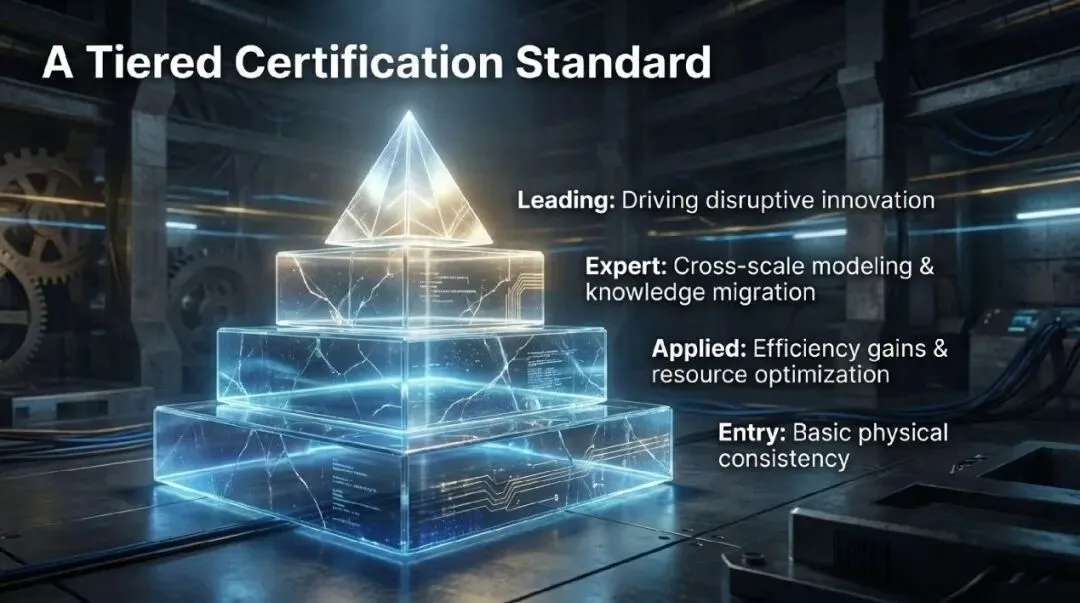 不是所有工业AI都需要达到同样的水平。一个辅助概念设计的工具,与一个用于飞机结构认证的系统,要求完全不同。所以,排行榜应该是分级的、场景化的。可以参考软件成熟度模型(CMM),定义几个等级:入门级:满足基本的物理一致性,能完成简单的设计任务,有基本的可解释性。这是工业AI的准入门槛。应用级:能在特定行业场景中,实现3倍以上的效率提升,10%以上的资源优化,有完整的可追溯性。这是实用工业AI的标准。专家级:能处理复杂的多尺度问题,实现跨领域的知识迁移,通过主要行业认证。这是高端工业AI的标杆。领先级:能驱动颠覆性创新,发现未知的设计原则,建立新的行业标准。这是工业AI的前沿。每个等级都有明确的评估标准和认证流程。AI系统可以在不同场景中获得不同级别的认证。建立持续评估机制