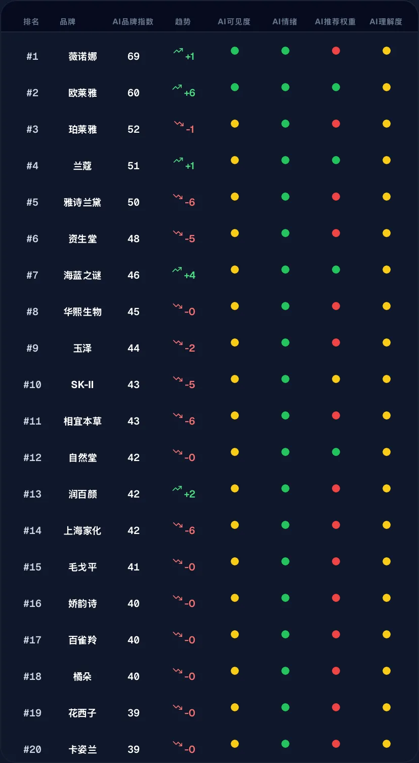 新王登基:敏感肌赛道王者 薇诺娜(69分) 稳坐榜首,国货之光在AI认知中率先突围。