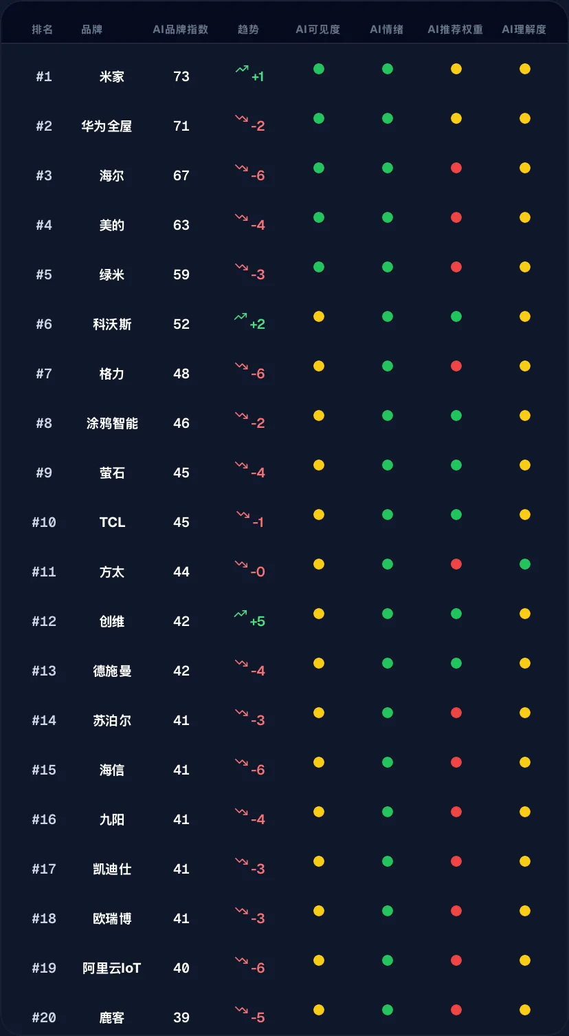 ⚠️ 华为全屋 (71, -2) 紧随其后,但指数微跌,显示其“全场景”心智面临短期挑战或竞争分流。