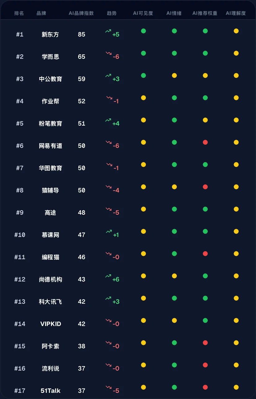 所有品牌的“AI可见度”与“AI情绪”指标均为良好(绿色),这说明教育品牌普遍被AI“看见”且口碑基调正面。真正的差距在于“AI推荐权重”与“AI理解度”(出现黄、红点),这意味着品牌在AI认知中是否具备清晰、独特、值得被主动推荐的“价值标签”,将成为胜负手。
