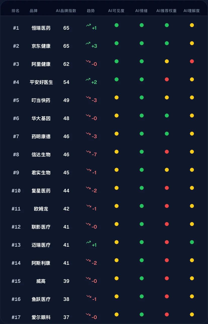 🚀 最大冲击者:京东健康 (+3) 是头部品牌中上升最显著的,显示其整合“医药电商+在线医疗”的模式获得强烈AI认知认可。
