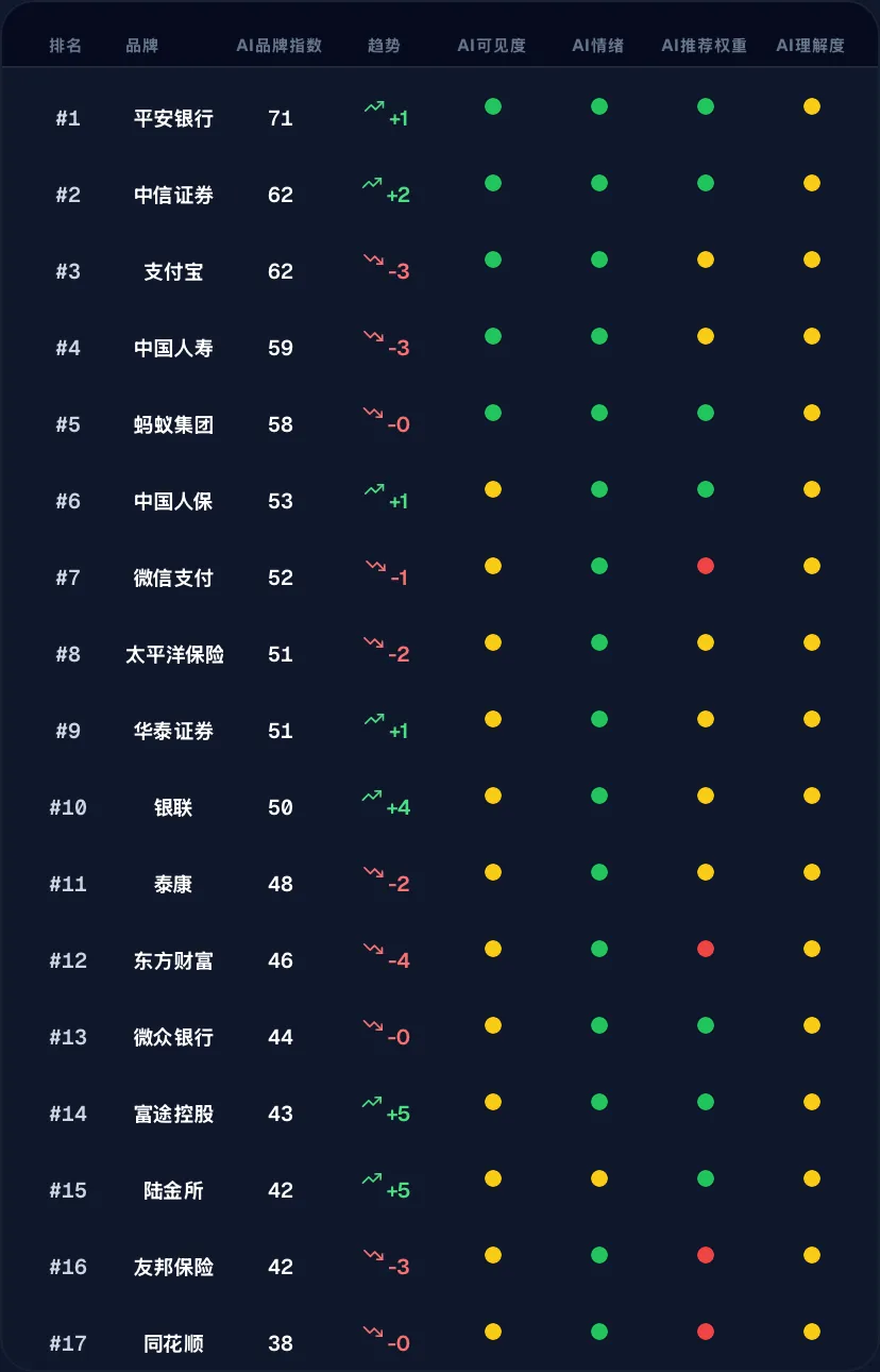 平安银行 (71分) 稳居第一。中信证券 (62分) 与支付宝 (62分) 并列第二,但趋势一升一降,格局微妙。