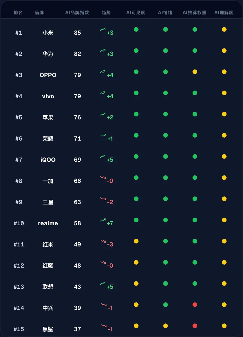 三星 (-2) 与 红米 (-3) 指数回落,显示国际巨头与细分品牌在AI认知维护上均面临挑战。品牌热度在激烈竞争中呈现动态波动。