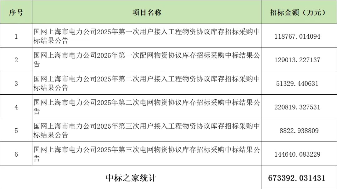 中标排名!国网上海市电力公司2025年物资协议库存中标排行榜发布!