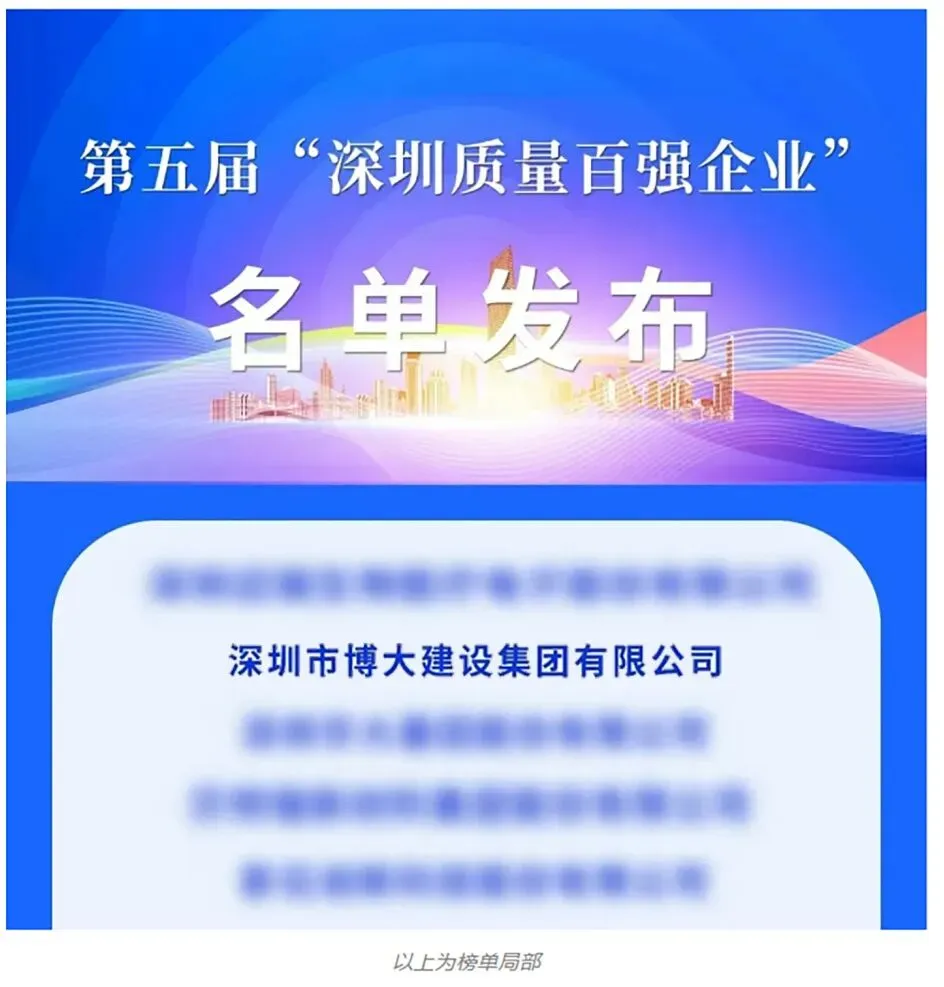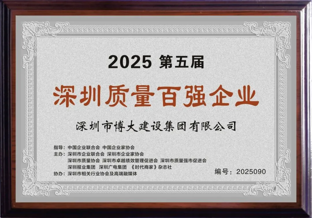近日,第五届“深圳质量百强企业”榜单正式揭晓。博大建设集团凭借在质量指标、经济效益、技术创新、市场口碑、客户满意度及社会责任等多维度的突出表现,成功斩获此项殊荣,与迈瑞医疗、华大基因、影石创新等各领域标杆企业共同彰显“深圳创造”、“深圳质量” 的雄厚实力。