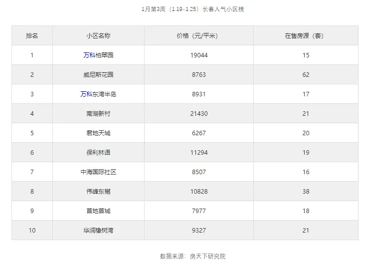 房天下研究院数据显示,万科柏翠园1月第3周(1.19-1.25)成为长春人气最高小区。据了解,该小区位于南湖新村中街999号,目前价格为19044元/平米,与此同时,威尼斯花园和万科东湾半岛等小区也入榜。