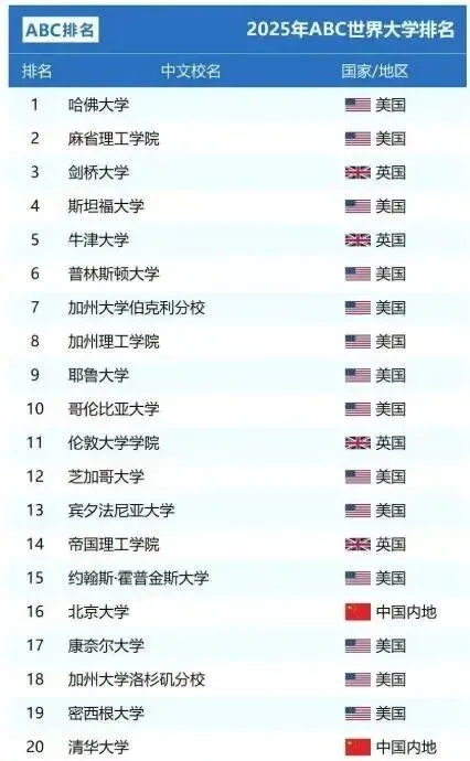 在2025年发布的ABC世界大学排名中,来自全球67个国家和地区的1000所高校成功上榜。
