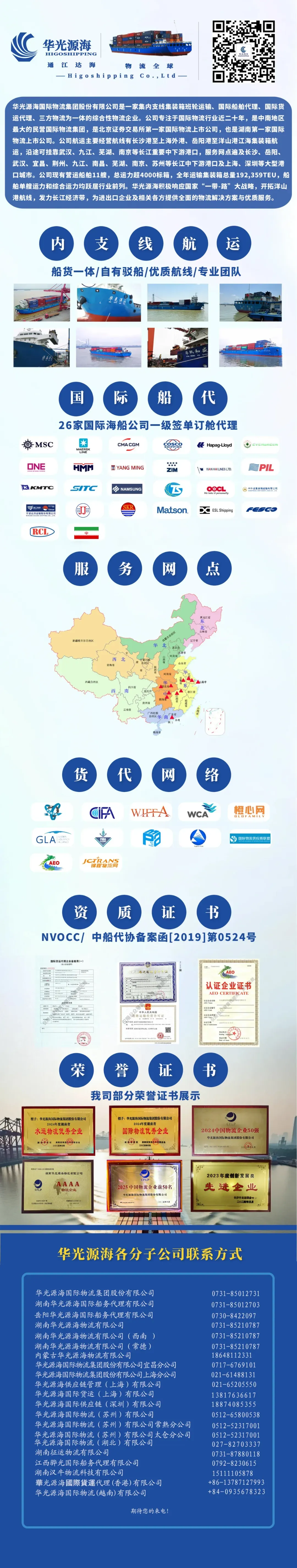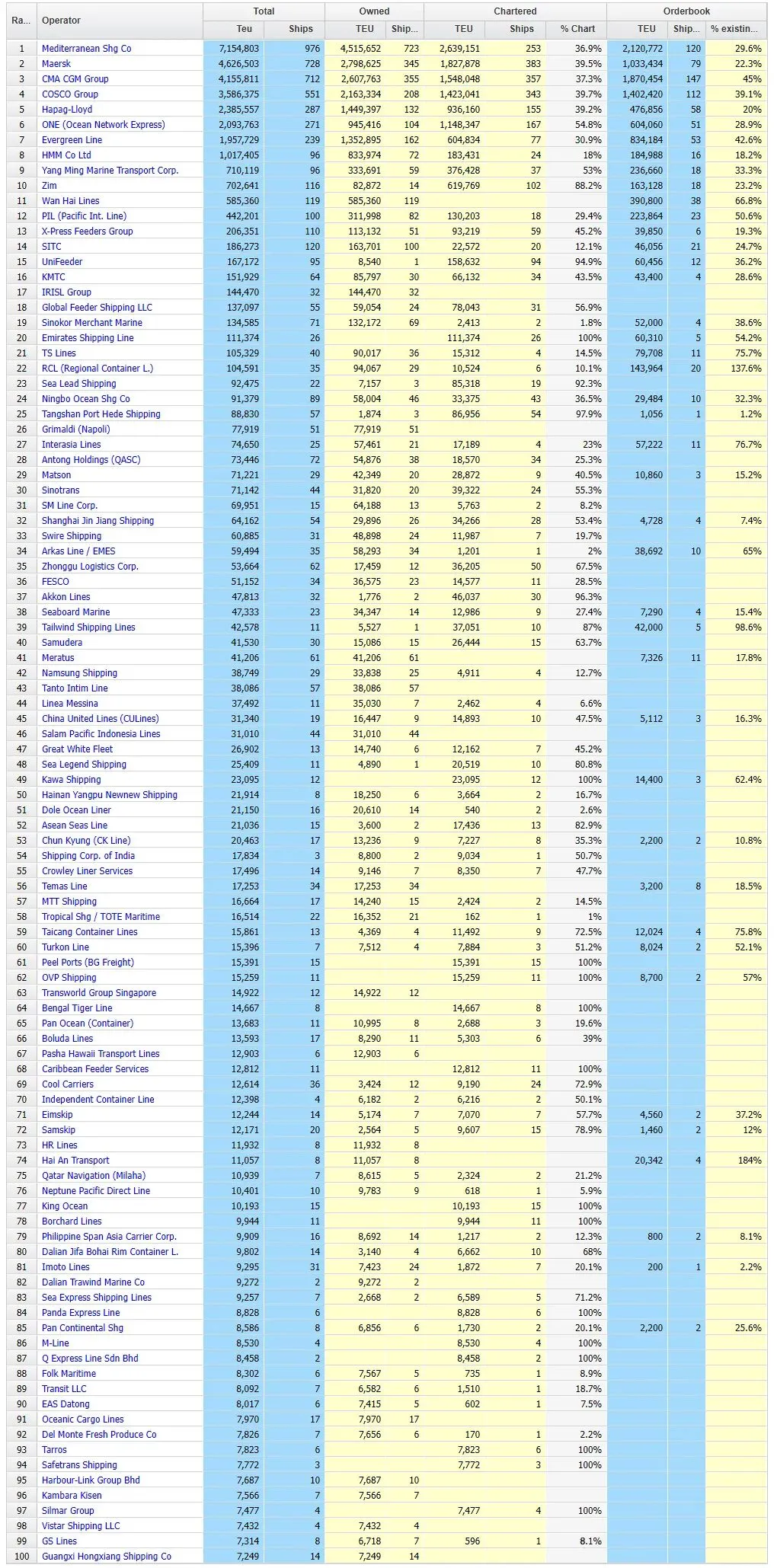 在上榜的中国内地班轮公司中,中远海运集团排名第4位,海丰国际排名第14位,宁波远洋排名第24位,唐山港合德海运排名第25位,安通控股(泉州安盛船务)排名第28位,中外运集运排名第30位,上海锦江航运排名第32位,中谷新良海运排名第35位,中联航运排名第45位,洋浦鑫远船务排名第50位,太仓港集装箱海运排名第59位,海安新港港务排名第74位,大连集发环渤海集运排名第80位,大连信风海运排名第82位,天津达通航运排名第90位,广西鸿翔船务排名第100位。