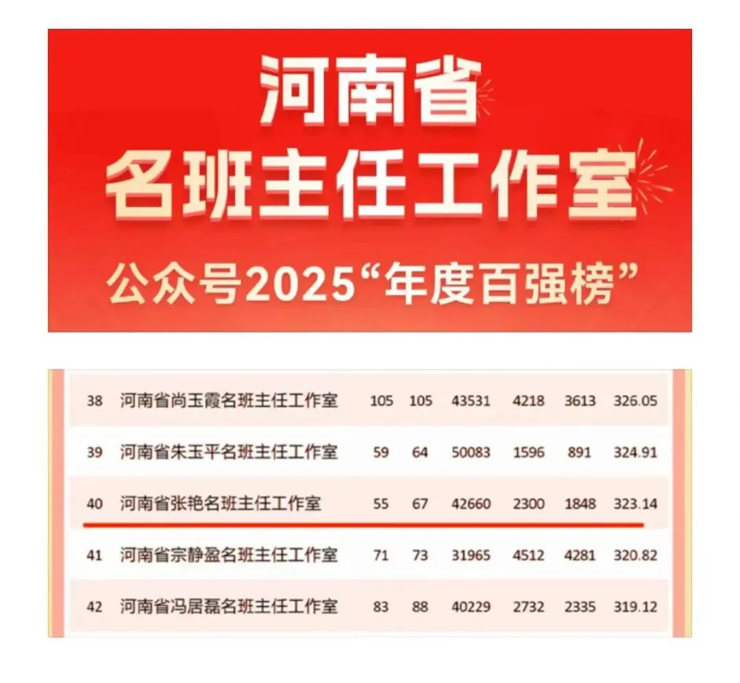 河南省张艳名班主任工作室,凭借优质育人内容与强劲专业影响力,在全省近200家省级名班主任工作室公众号年度评选中脱颖而出,斩获2025年度排名第40名的亮眼佳绩!