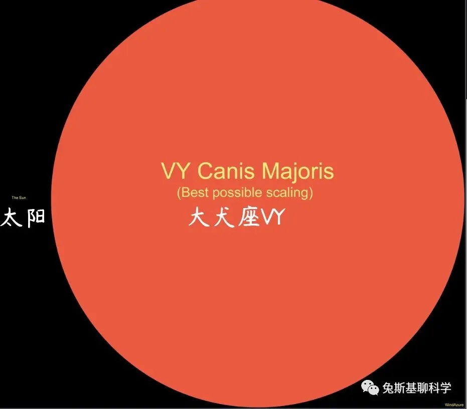 大犬座VY是一颗位于大犬座的红特超巨星,质量约为太阳的30~40倍,距离地球3900光年。大犬座VY的半径约有1420倍太阳半径,即大约9.88亿公里。因此,要是把这颗恒星放在太阳系中心太阳的位置上,它的表面也会超过木星轨道。它可以装得下大约29亿个太阳,是目前已知的体积第九大恒星。与此同时,大犬座VY的亮度是太阳的50多万倍,是目前已知的最亮的恒星之一。