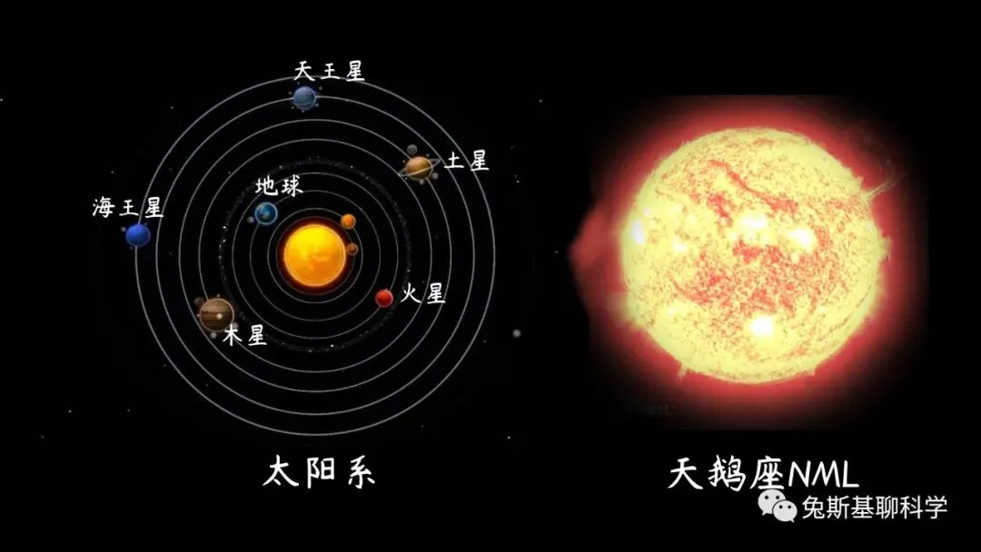 这是一颗红特超巨星,位于天鹅座,距离地球大约5500光年。天鹅座NML的半径大约是太阳的1650倍,即大约11.5亿公里,体积大约是太阳的45亿倍,位列十大恒星排行榜第三位。把天鹅座NML放在太阳系中心太阳的位置上,它的半径快接近土星轨道了。天鹅座NML的质量大约是太阳的50倍。天文学家认为,这颗恒星只有600万年的寿命。最终它会在超新星爆发后成为一个黑洞。