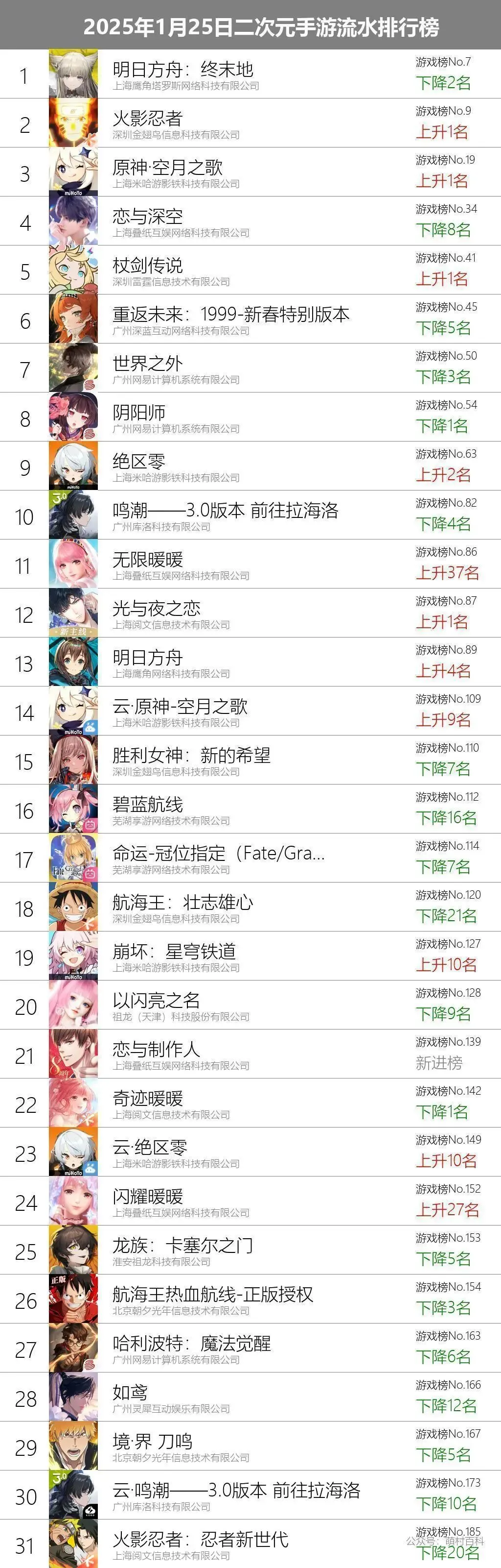 1月25日二次元手游流水排行榜。数据来源于iOS中国区畅销榜数据,数据节点为2026年1月25日22:00。