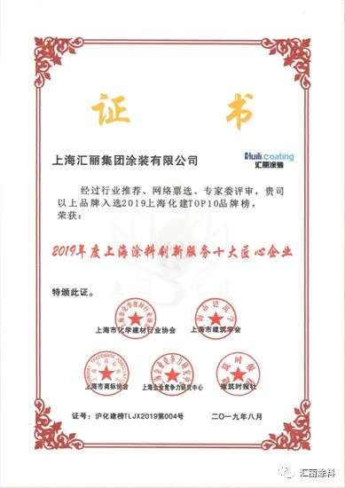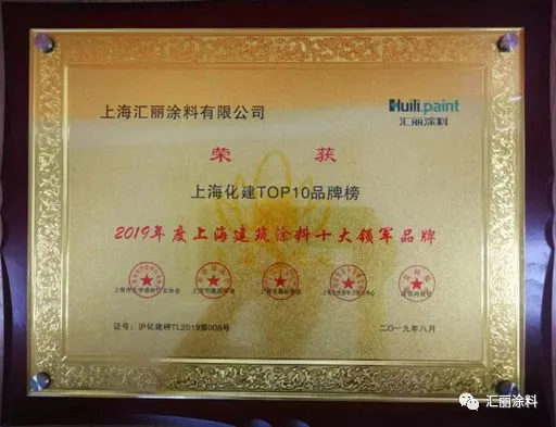 上海汇丽涂料凭借完善的涂装体系和服务、过硬的产品质量、良好的市场口碑,最终从众多候选品牌中脱颖而出,入选2019上海化学建材Top 10品牌,兄弟公司上海汇丽集团涂装有限公司也荣获了“2019年度上海涂料刷新服务十大匠心企业”荣誉称号。