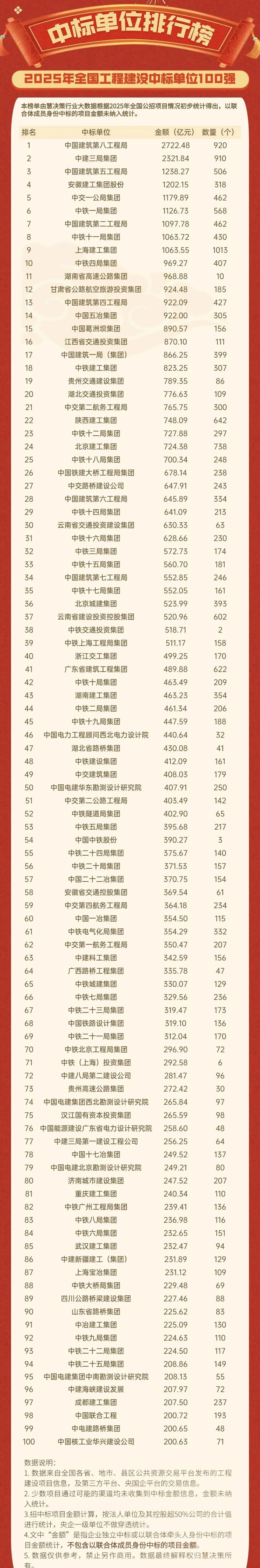 >重磅!2025全国工程施工中标100强榜单新鲜出炉!