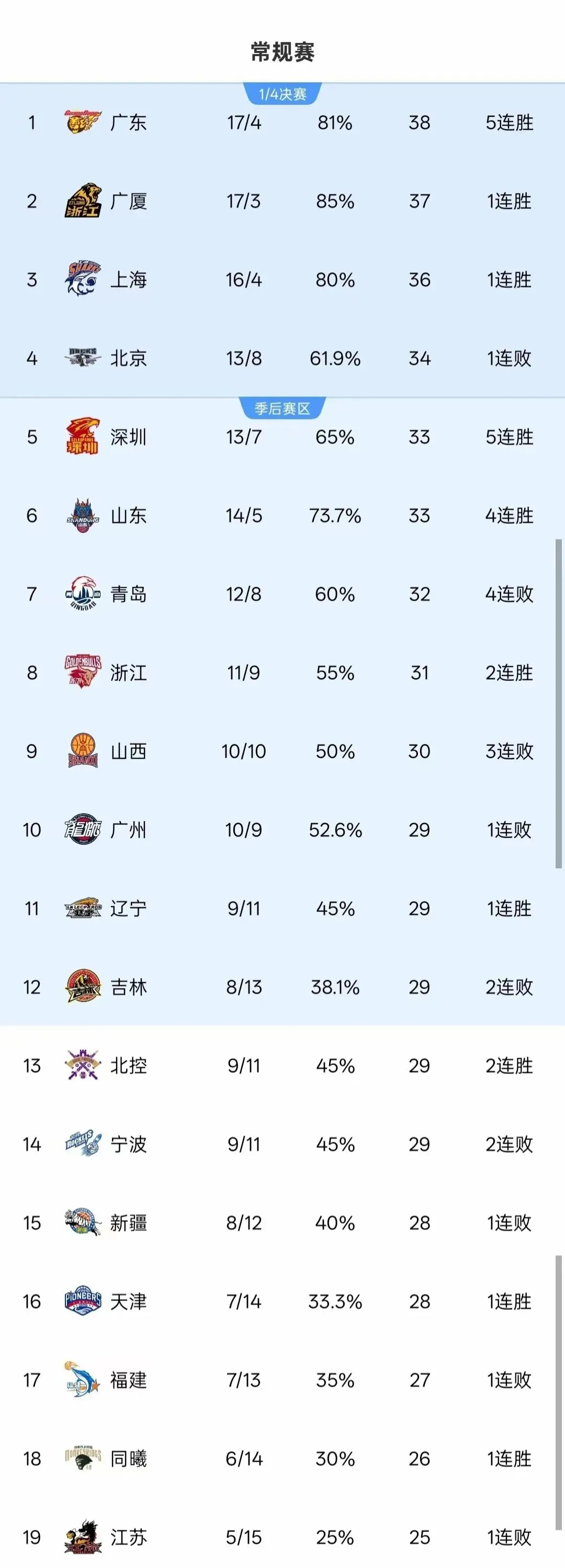 此役过后,广东队不仅巩固了自身状态,更在榜首争夺战中占据主动,与广厦(17胜3负)、上海(16胜4负)组成的“第一集团”优势明显,已与身后球队拉开差距,前三位排名基本稳定。