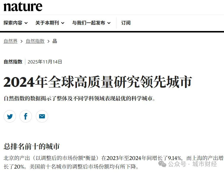 国际权威学术出版机构施普林格·自然最新发布的《自然指数—科研城市》报告显示,全球科研城市十强中中国占据六席,首次在榜单中超过半数。北京、上海连续多年稳居前两位,南京、广州、武汉保持前十,杭州首次跻身全球前十,从去年第十三位跃升至第十位。这一变化引发国际科学界广泛关注。