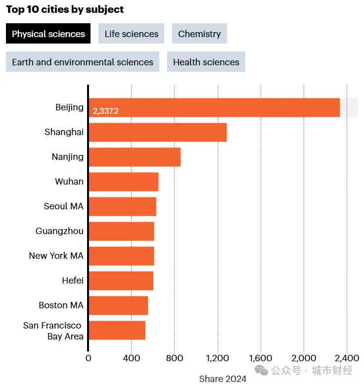 在学科分布上,中国城市展现出明显优势。化学领域全球前十被中国城市包揽,物理科学和地球与环境科学领域各占六席。北京在这三个学科均位居全球第一。不过,生命科学和健康科学领域仍由美国城市主导,纽约和波士顿在生物科学领域位居前两位。