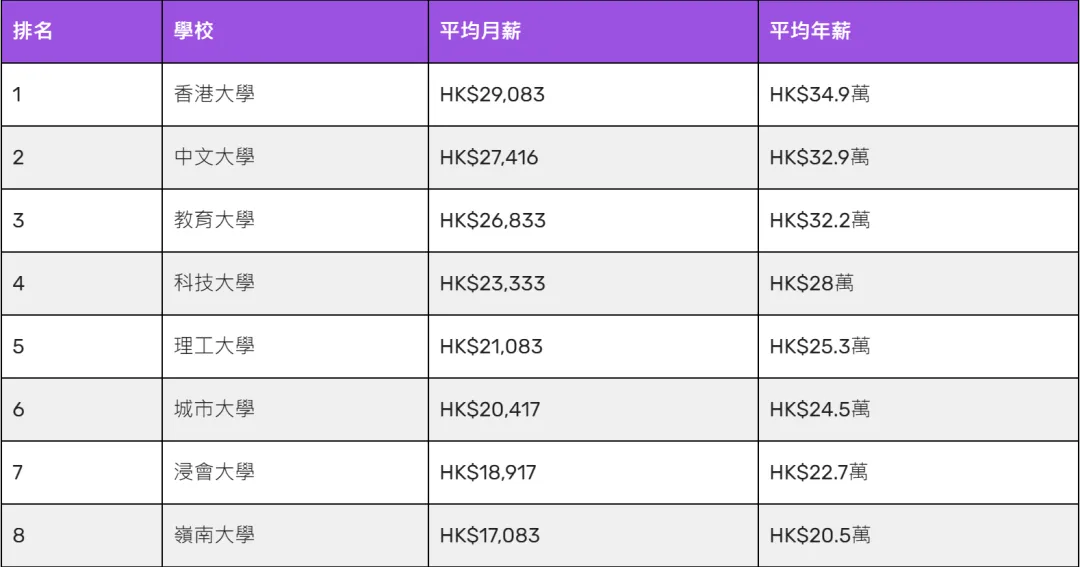 举个🌰,由港媒最新统计的数据现实,香港八大高校毕业生平均年薪为HKD 28万,排在前三的年薪都在HKD 30万以上。