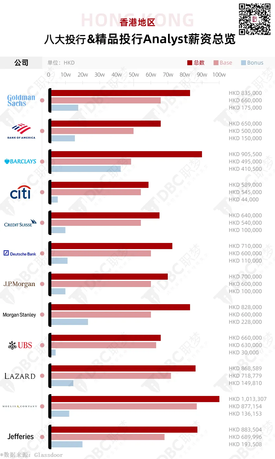 薪资光看学校毕业生的也不足以为证,香港企业给出的薪资才是实打实的。就拿商科生的求职第一目标投行来说,给出的薪资那才叫一个高!数据显示,八大投行和精品投行给出的base薪资基本上都超过了HKD 50万。图/DBC职梦自制