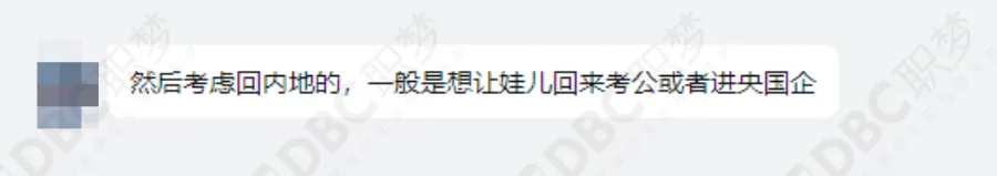 家长希望孩子回内地发展的第一个原因就是:希望孩子能进国企央企,有一个“铁饭碗”工作就行了。