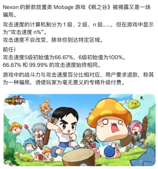 此前,在去年11月6日至12月2日期间运行的《枫之谷》中,存在长达一个月的故障:付费购买的“能力选项”的最高数值并未按照预设概率显示出来。最近还发现,角色攻击速度的实际表现与显示数值并不一致,这一问题引发了争议。